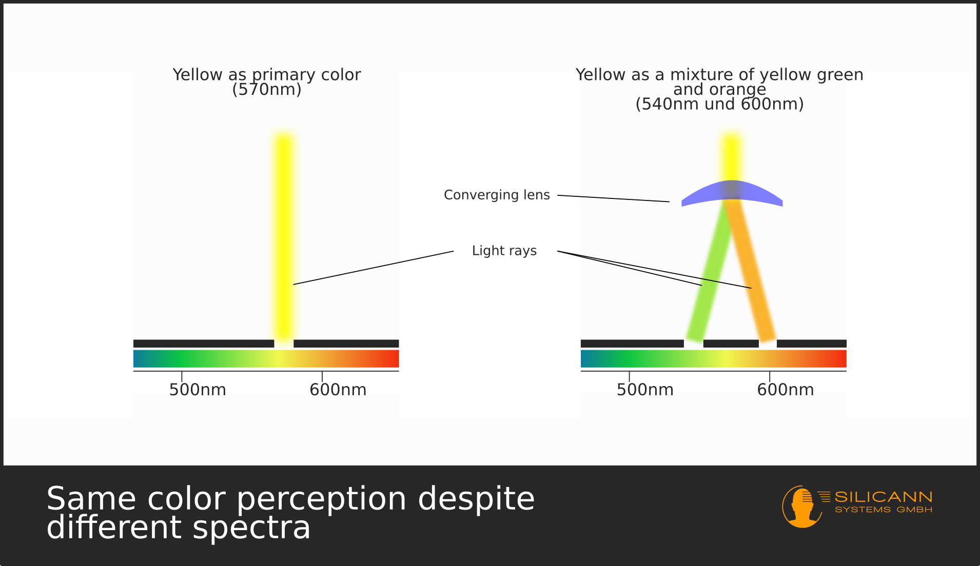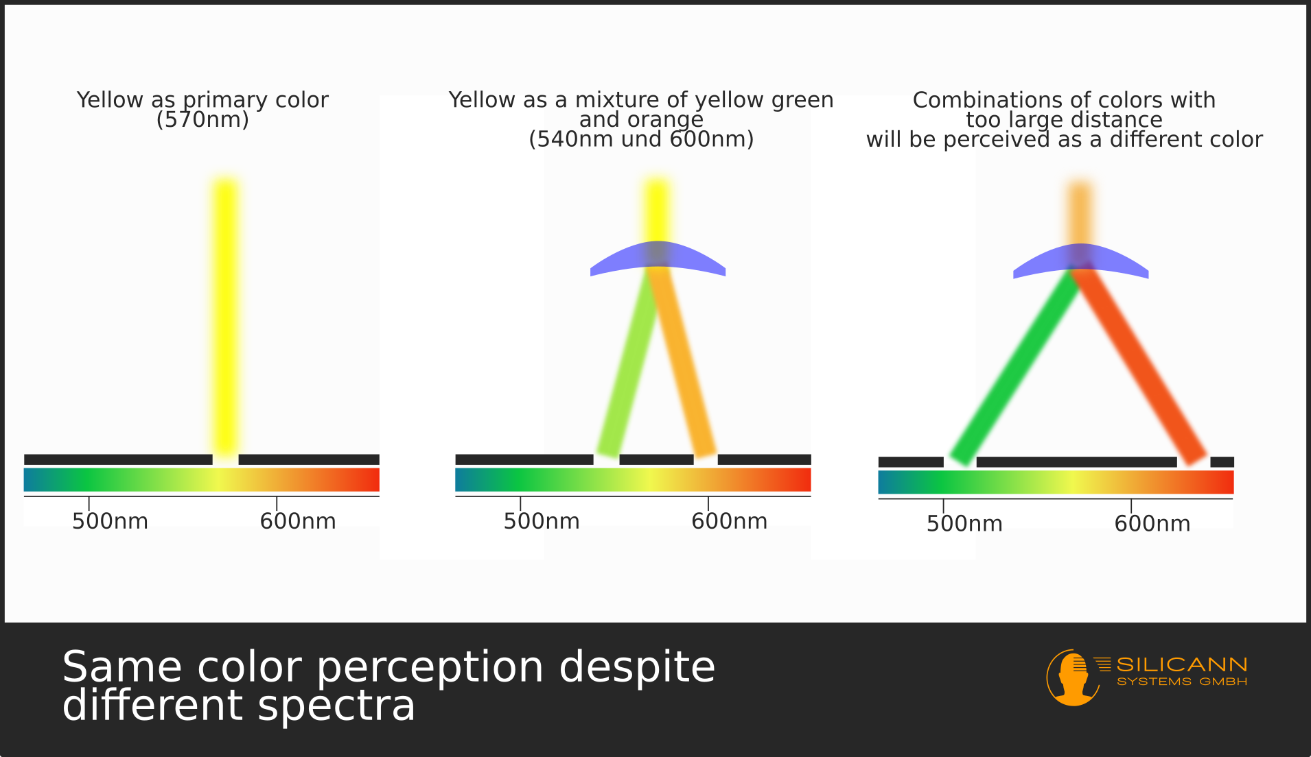 This also explains how metamerism happens: Two objects, appearing to be of identical yellow color when looked at under e.g. daylight, could actually reflect quite different spectral patterns. While one of the objects reflects a narrow band of around 570nm (yellow), the second object perhaps reflects both at 530nm (yellow green) and 610nm (orange). The average of these two spikes in the spectrum also results in 570nm. The combined signal resulting from the interconnection of the M cone and L cone produces the same result as for the first object. To our human eyes, both objects will have the same color.