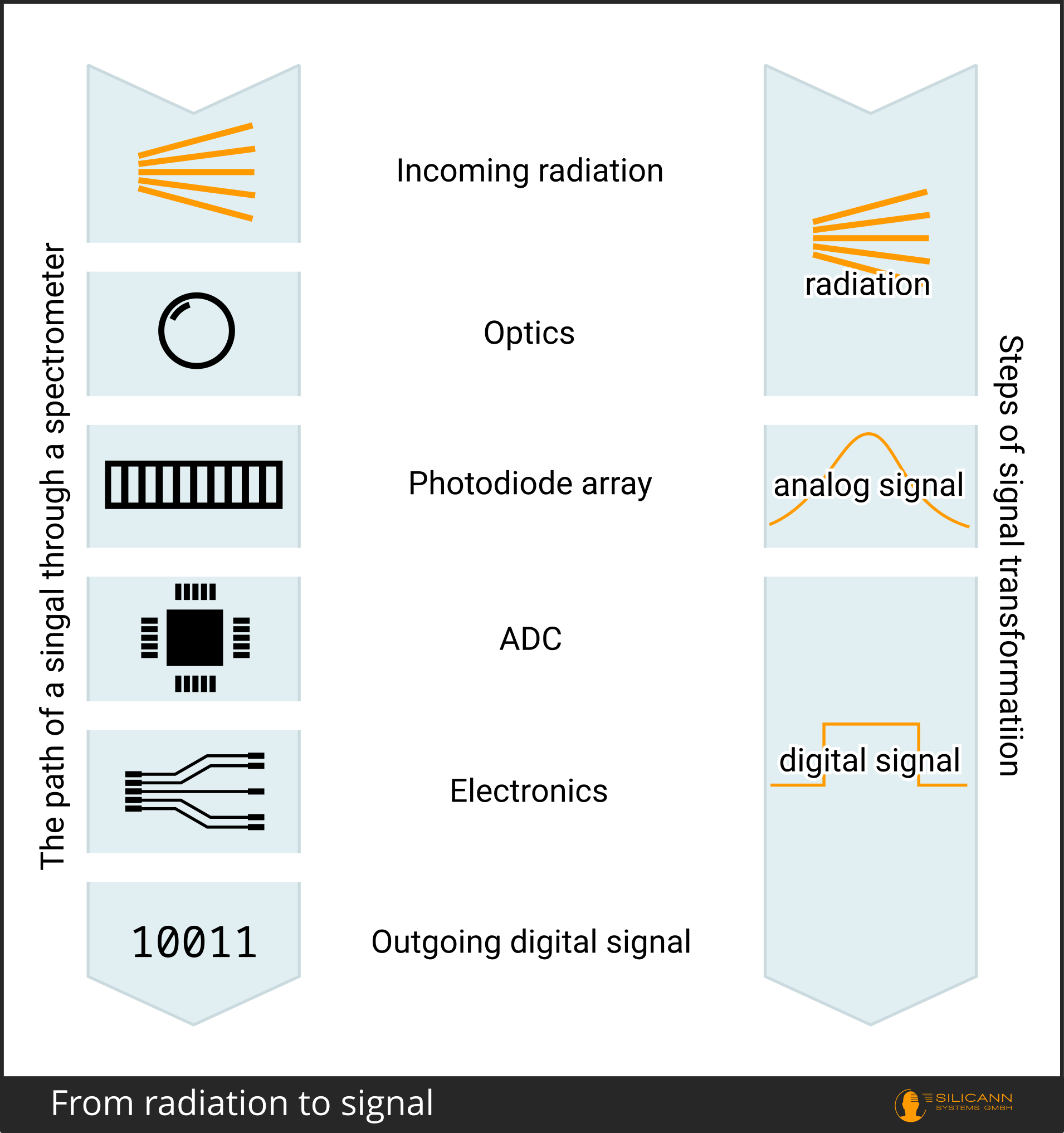 As a reminder: In spectrometers, light, i.e. electromagnetic radiation, hits the entrance of the device, passes through the optical structure, is fanned out by wavelength and finally reaches the photodiode array. This array consists of individual light-sensitive pixels, whereby each pixel only receives a specific wavelength range. Alternatively, mainly in laboratory devices, there is also the classic setup with just one photocell, to which the individual wavelength ranges are then directed one after the other thanks to a movable prism. Whether one pixel or many, the incoming radiation is now converted into electrical voltage at this point.